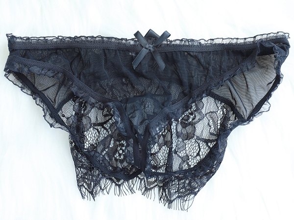 ブラックのシースルー生地をベースに、フリルを使ったトリミングやリボンの装飾がカワイイ感じを演出してくれるフルバックタイプのショーツで、フロントとバックの印象が大きく違う二面性が楽しめます♪大きくラウンドカットされたヒップサイドには大きめなサテンリボンと、優雅なフローラルレースで装飾され、かなり大胆なデザインになっています!