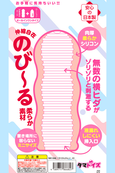 どんな時でもすぐ使える、携帯タイプの非貫通オナホール♪肉厚柔らかシリコン使用!横ヒダタイプで無数の横ヒダがゾリゾリと刺激!伸縮自在の、のび〜る柔らか素材なのに、液漏れしにくい挿入口!舐めても安心・安全な日本製のローション付きのオールインワンオナホ。