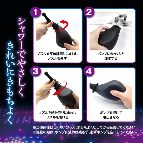 アナルほか噴出洗浄器「エイナスシャワー」!ラブ・ライフにぴったりな多目的洗浄器が新登場。 大容量360ミリのポンプに水を入れれば、先端ノズルの四方の穴からビュビューッと噴出できちゃいます!先端ノズルは、差し込んで使えるように、硬めのハードシリコン仕様。 ポンプは、水を押し出すように、ふんわり柔らかなソフトPVC素材!ノズルとポンプは分割可能なので、注水やお手入れも簡単です。 いろいろ使える噴出ポンプなので、アナルやアソコの洗浄はもちろん、オナホの内部洗浄もOK!中に液体を変えれば、ローション注入器や洗浄液注入器とも使えちゃう! |