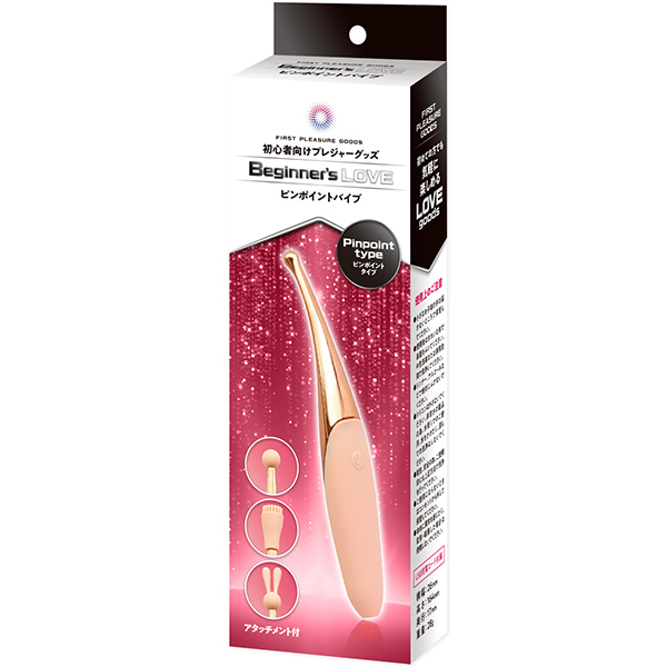 〜初めての方に優しく愛を込めて〜初心者(入門者)に特化したをBeginner’s Loveシリーズが新発売スタンダードなピンポイントバイブの入門商品です。 <ピンポイントバイブ>・クリト〇スや乳〇等を集中的に刺激可能・シンプルなワンボタン式で面倒な操作は不要・3種のアタッチメント付きで様々なシーンで楽しめる・振動パターンもオーソドックスな5種類を実装・バイブ初心者でも挿入しやすい、スリム設計ボディ■使用方法@同封のUSBケーブルを本体の下部にしっかりと差し込み充電します。 Aボタンスイッチの長押しで、電源オンになります。 Bボタンスイッチを押すごとに、バイブレーションのパターンが変わります。 Cボタンスイッチの長押しで、電源がオフになります。 Dご使用後は乾いた布でやさしく拭き、乾燥させてください。 |