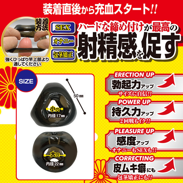 根元&竿&玉の3点をハードに締め上げ、最高の射精感を促します!SEX中の激しいピストンでも抜ける心配もありません。 ご自分に合った装着方法をみつけて、SEX・オナニーを楽しもう♪ |