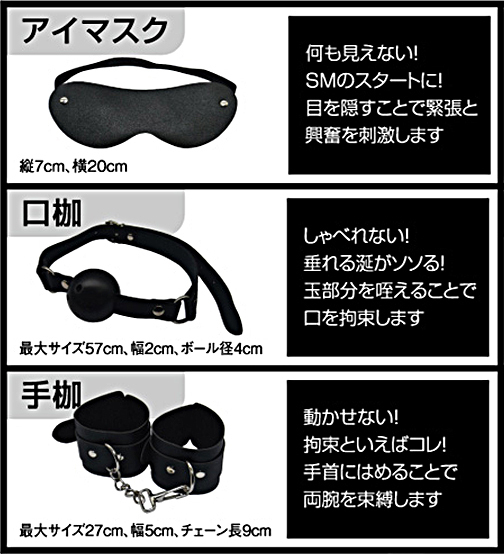 これひとつでSMプレイを網羅する豪華8点セット!SMプレイをスタートしたい、ビギナーなアナタにぴったりなSMグッズセットです。視覚を奪って緊張感が高まる「アイマスク」言葉を塞いで垂れる涎がそそる「口枷」動きを束縛する本格派拘束「手枷」身を捩る動きが音を奏でる「乳首クリップ」叩いた音が嗜虐を煽る「バラムチ」。 SMプレイをすぐに始められる、厳選の全5アイテムです。 |