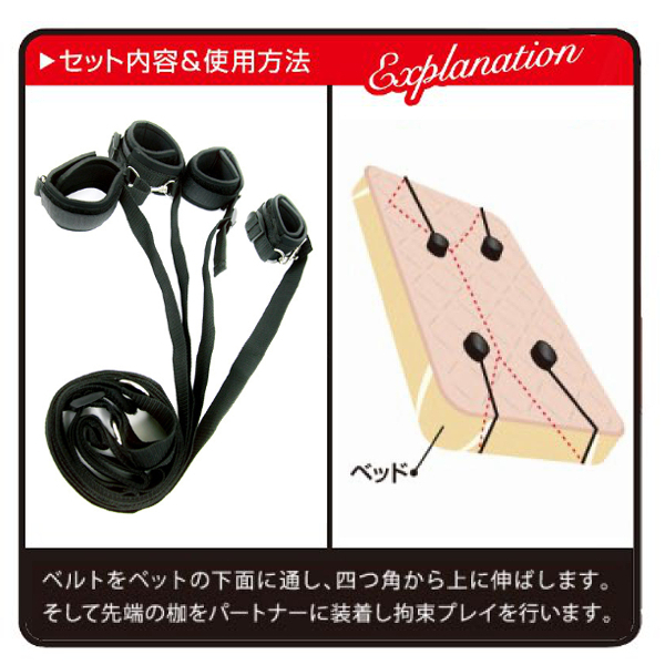 ベルトをベッドの下に通して上下から出し、手枷と足枷をパートナーに装着したら完成!ベッドの脚に繋がなくても良いので、マットレスタイプでも使用可能です。 枷はマジックテープ式でサイズ調節も楽々!肌に当たる部分はソフトなウレタン素材を使用し、お肌を痛める心配もありません。 エロ絵師、尾髭丹氏の肉感的なパッケージにも注目です。 ※設置場所の状態を確認してからご使用ください。 |