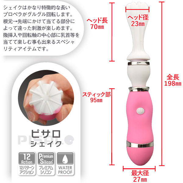 長いプロペラ付のヘッド部分がクルクルと回転し敏感部分を刺激♪当てる部位によって異なる刺激をお楽しみいただけます。 アクションは12種類搭載!持ち手にはマットラバーを、ヘッドには柔らかな医療用シリコンを採用し長時間のプレイにも対応、メンテナンスしやすい生活防水設計。 |