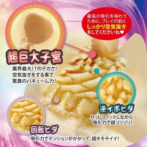 驚異の吸引力を実現した非貫通オナホです♪本体の最奥部には業界最大級のバキュームゾーンを搭載!しっかり空気抜きを行うことで、圧倒的な吸引感を体感できます♪中間部から手前に向かう回転ヒダ構造により、全体がしっかりと包み込まれ、心地よい刺激が生まれます。