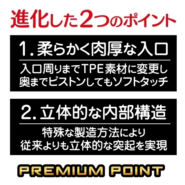 非貫通オナホの進化版として登場しました♪10年以上の実績を持つ定番モデルをベースに、クオリティをさらに追求した一品です!立体構造とくっきりとした凹凸が特長で、上下の向きを変えることで異なる感触を楽しめます♪内部はヒダとイボの混合構造で、繊細な刺激設計がされています!入口には厚みのある柔らか素材を採用し、やさしい肌あたりも魅力です♪ローションがあらかじめ充填されており、開封してすぐに使える手軽さもポイント!持ちやすく設計されたサイズと重量で、操作性にも優れています♪非貫通構造で衛生面にも配慮し、使い捨てタイプなのでお手入れも不要です!長年の人気と進化が詰まったプレミアム仕様をぜひお試しください♪