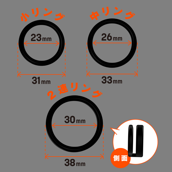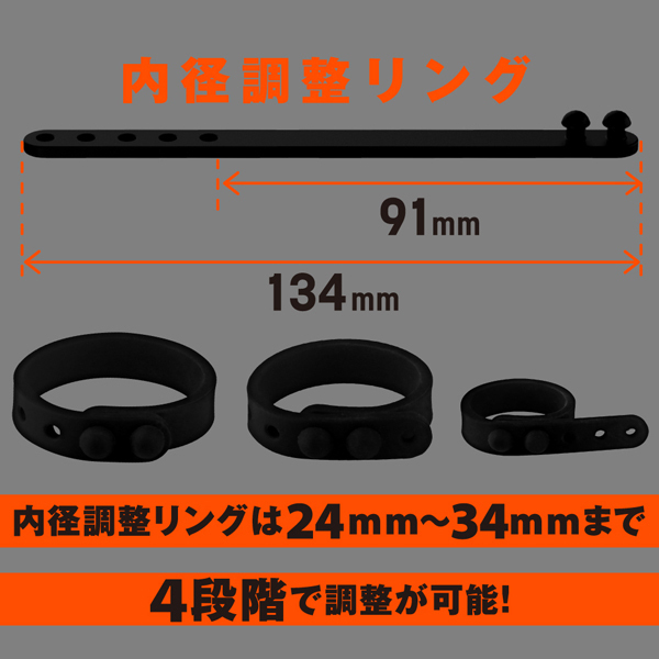 ベタつきのないサラスベ質感で着け心地抜群!一つだけ使うも良し同時装着もOK♪皮戻り防止や持続力アップなどシチュエーションに合わせてお使いください。 内径23mmの小サイズ、26mmの中サイズ、30mmの2連リング、そして自分の身体に合わせてサイズ変更できる内径調整リングの4個付属。 |