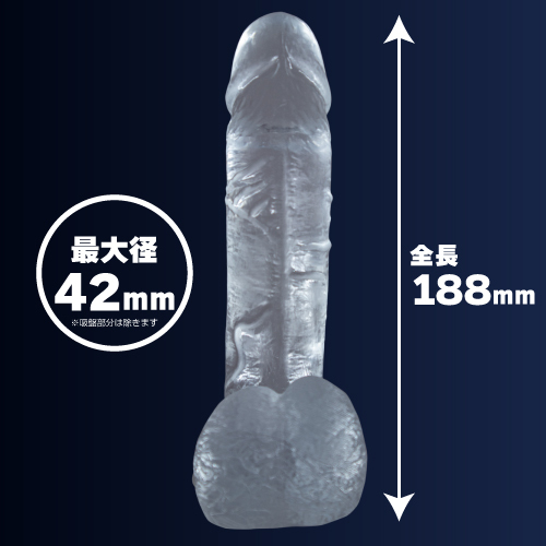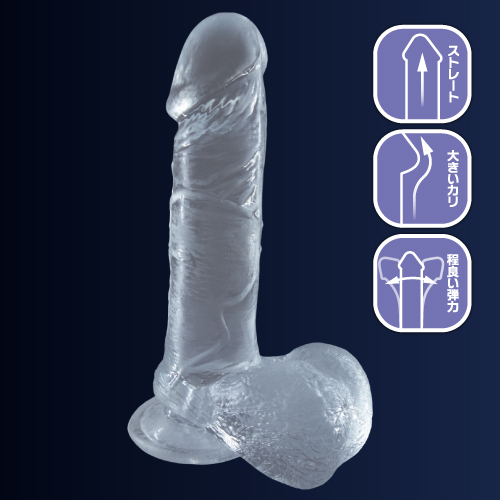 ストレート形状で大きなカリ、そして程よい弾力が特徴で、平均的な日本人サイズのペニスでは体験できない快感が味わえるのが自慢です♪太く、まっすぐ向き合う太い俺!透明ディルドで吸盤付きで、挿入感がたまらないので太さと大きさを求めている方におすすめです♪ |